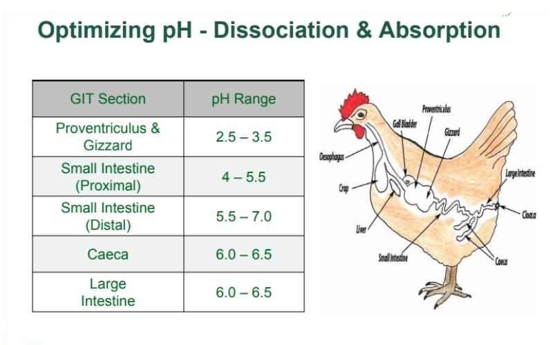 Đường tiêu hóa của động vật bao gồm ba phần chính: dạ dày, ruột non và ruột già. Ở mỗi phần đều có môi trường có độ pH khác nhau đáp ứng được nhu cầu tiêu hóa khác nhau khi thức ăn đi qua mỗi phần. Nhưng khi nói đến vai trò của pH thấp đối với vật nuôi thì chúng ta chỉ có thể đề cập đến tiêu hóa ở dạ dày vì dạ dày có pH từ 1-3, pH ở ruột non (tá tàng từ 5 – 6, không tràng từ 6-7, hồi tràng từ 7-8), pH ruột già 5.5 – 7.